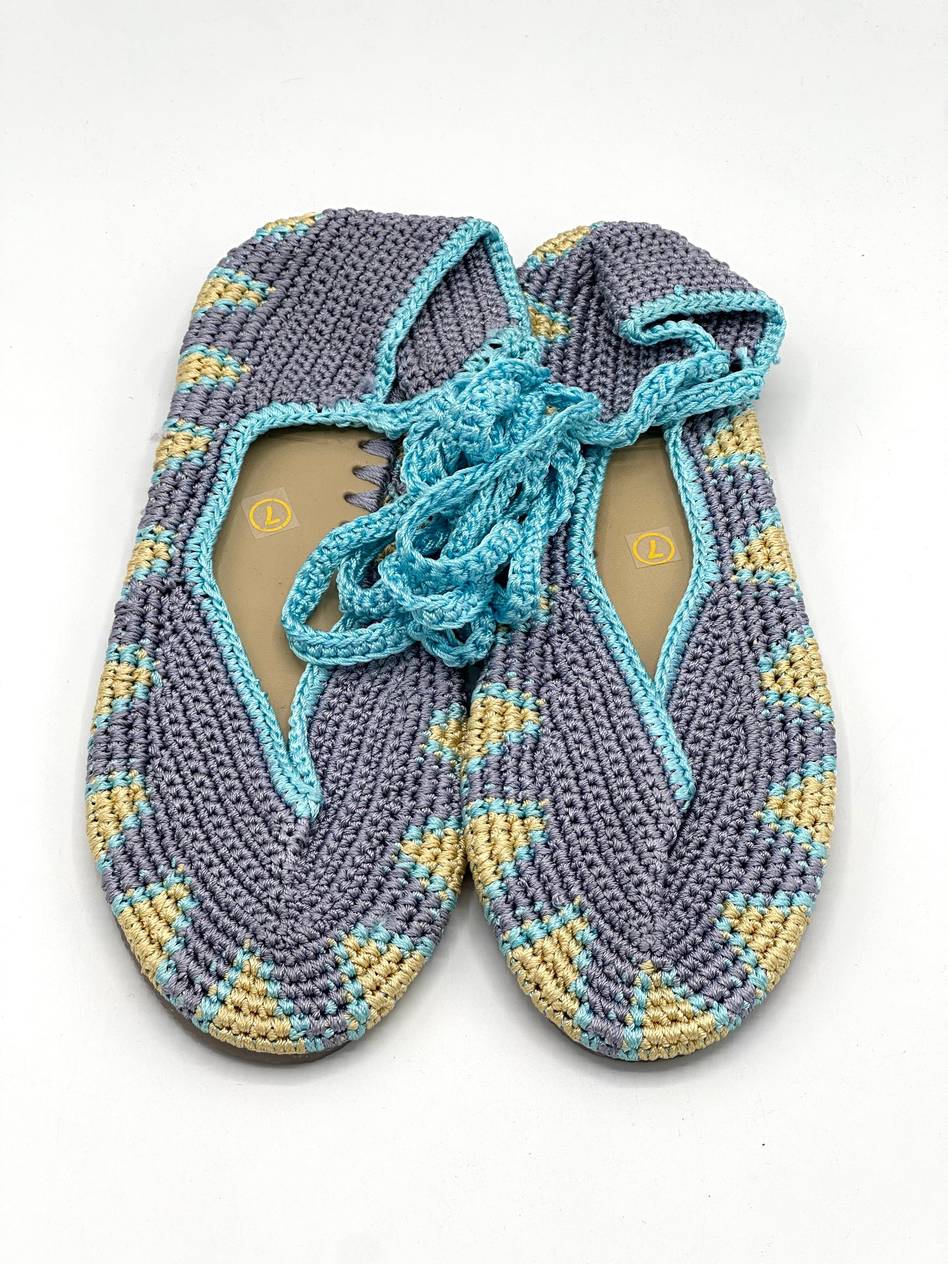 Bailarinas tejidas a mano con hilo de algodón y rayón, frescas, ligeras y perfectas para la primavera y el verano. Su suela de piel natural ofrece comodidad y estilo para uso interior.