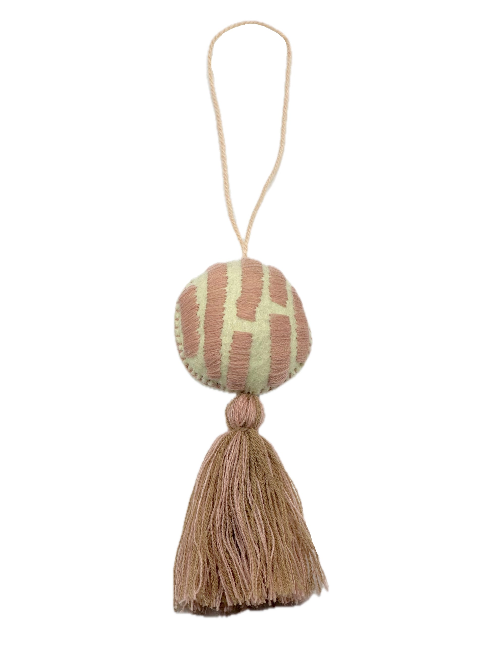Colgante artesanal de algodón en forma de bola, decorada con líneas de colores que le dan un toque vibrante y boho. Perfecto para personalizar bolsos, mochilas o para usar como sujetacortinas.