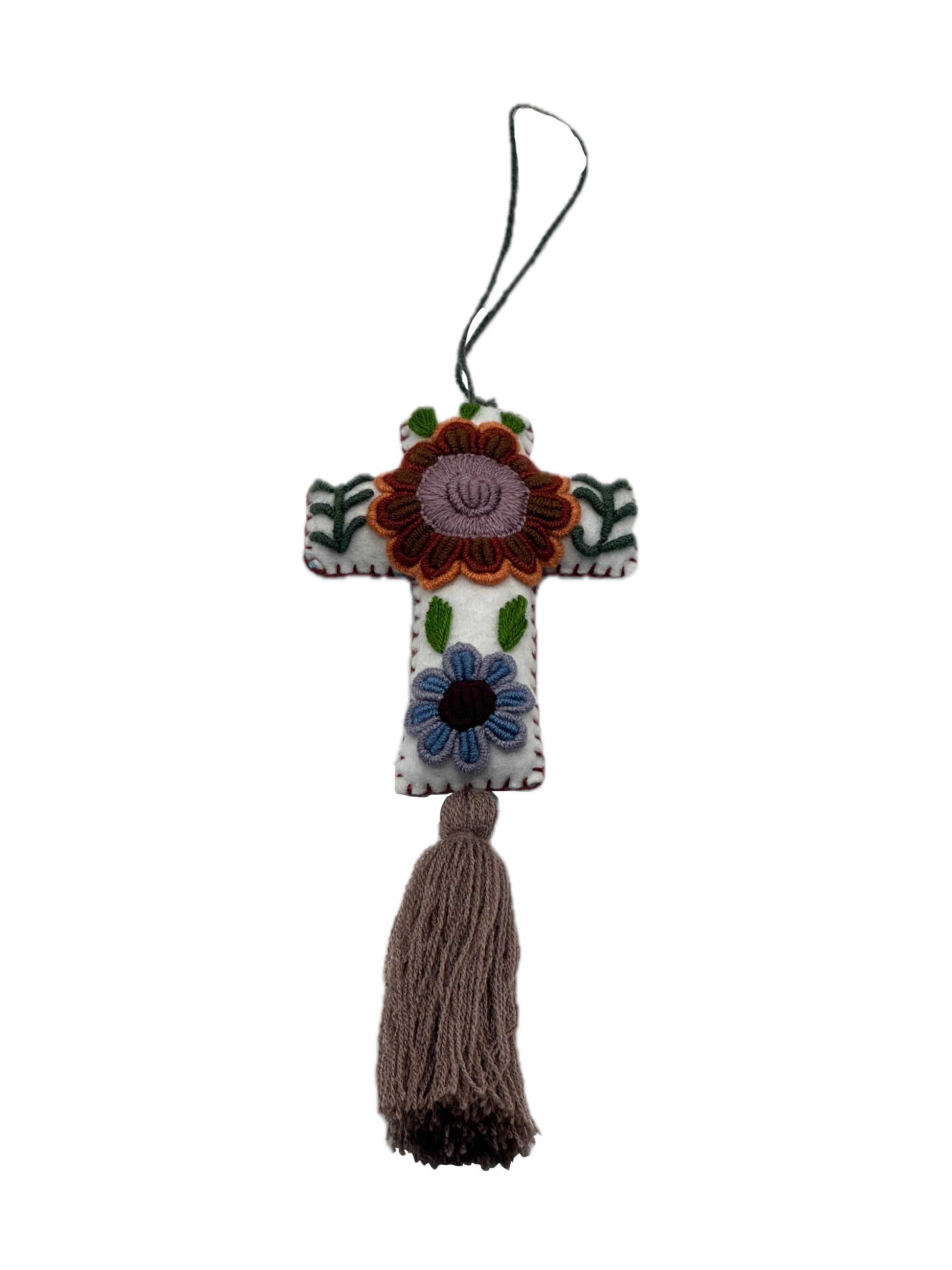 Charm de algodón hecho a mano en forma de cruz, inspirado en diseños tradicionales. Ideal para decorar bolsos, mochilas o como sujetacortinas. Cada pieza es única, con detalles bordados que le dan un encanto especial.