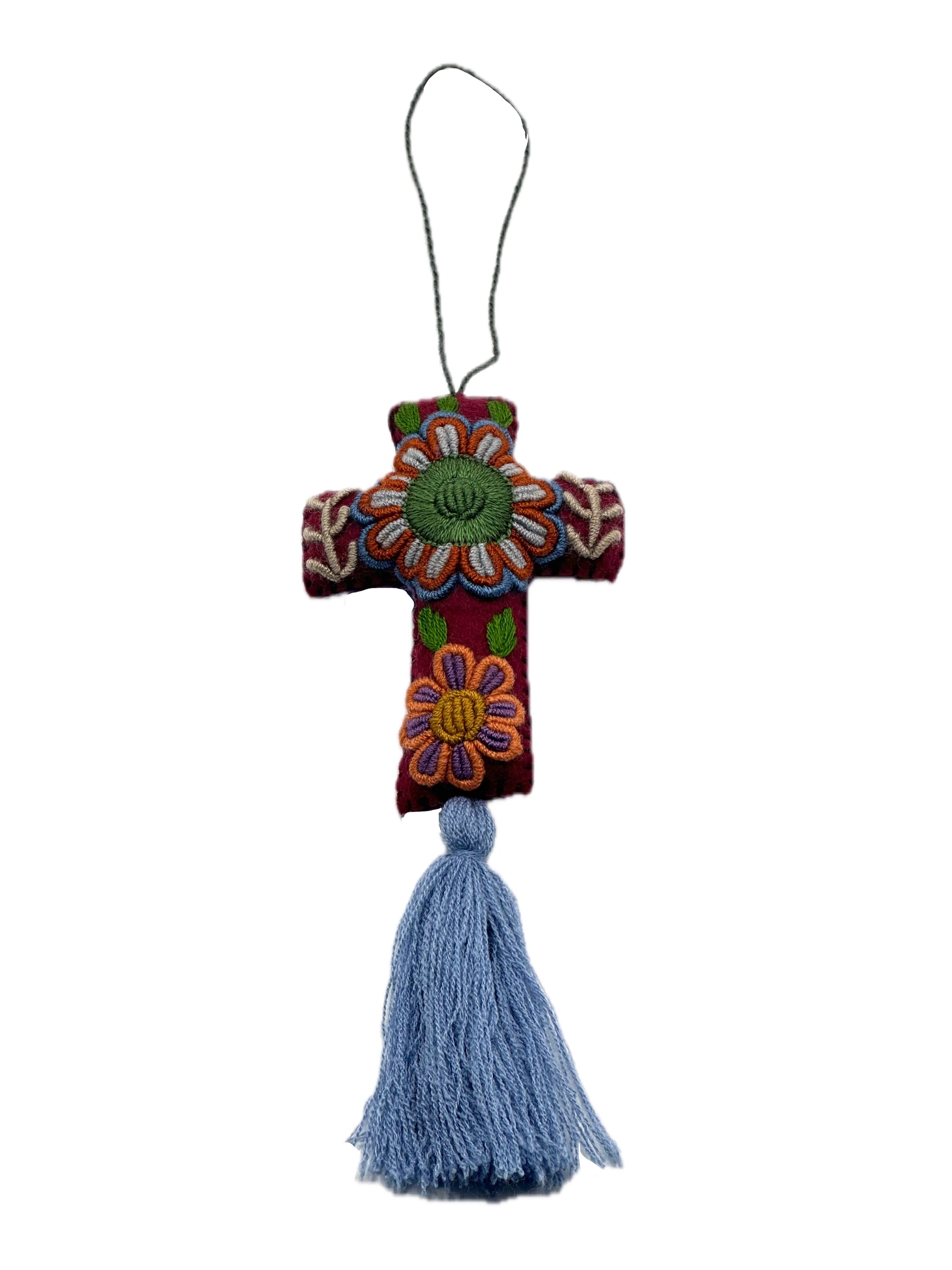 Charm de algodón hecho a mano en forma de cruz, inspirado en diseños tradicionales. Ideal para decorar bolsos, mochilas o como sujetacortinas. Cada pieza es única, con detalles bordados que le dan un encanto especial.