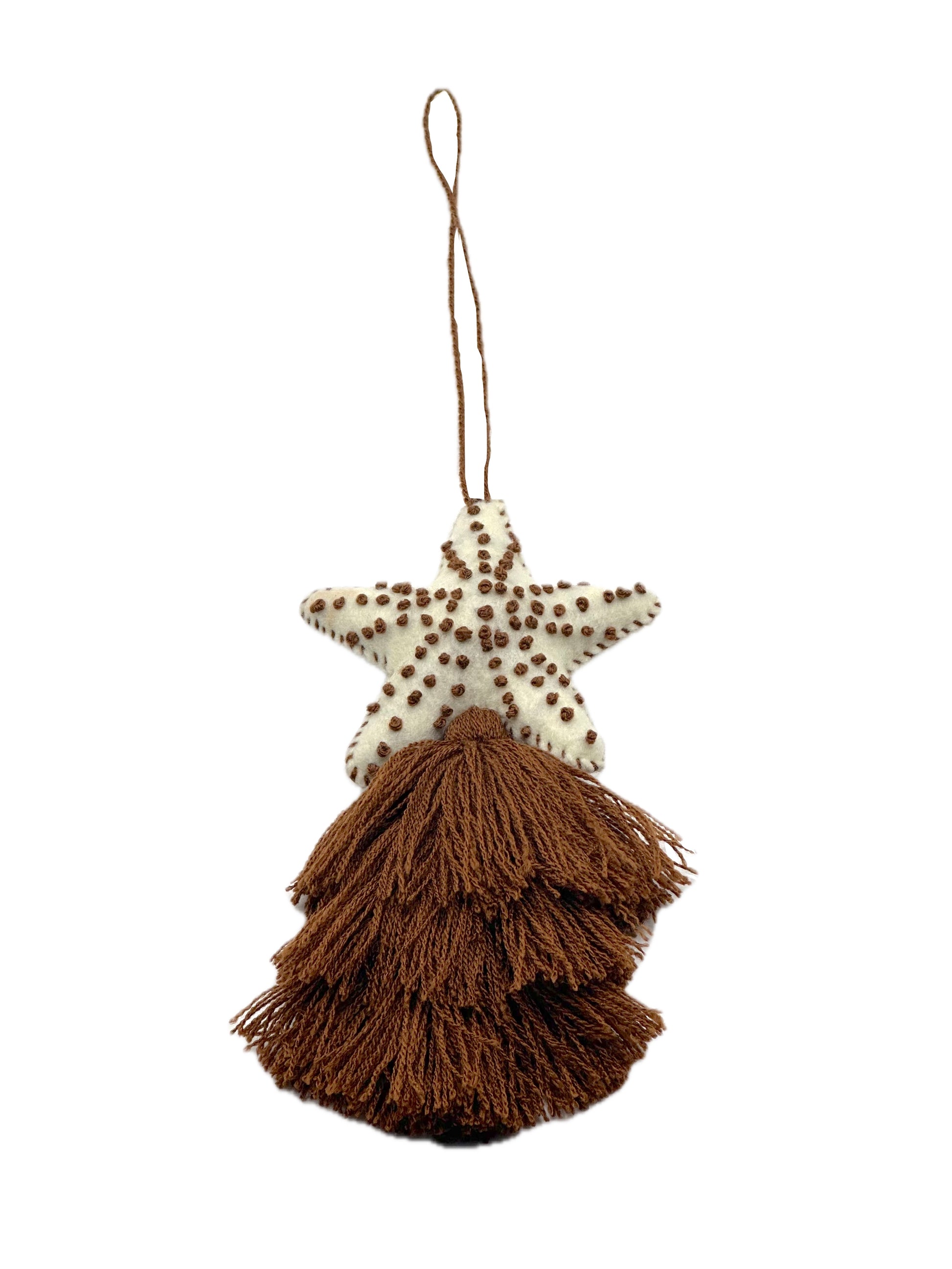 Colgante artesanal de algodón en forma de estrella, decorada con líneas de colores que le dan un toque vibrante y boho. Perfecto para personalizar bolsos, mochilas o para usar como sujetacortinas.