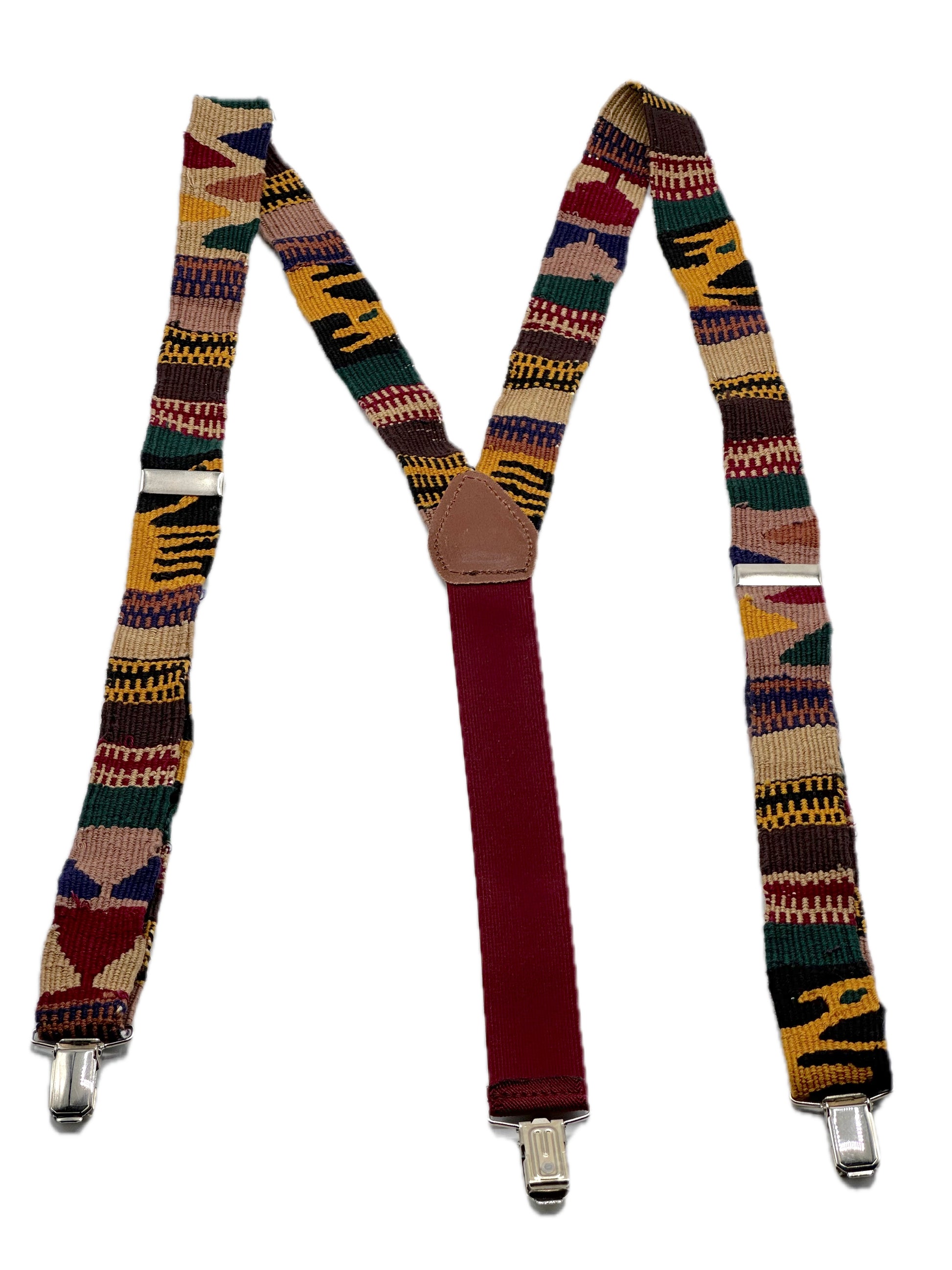 Tirantes para adultos con cinta étnica guatemalteca , 100% algodón tejida en telares por artesanos. Detalles en piel.